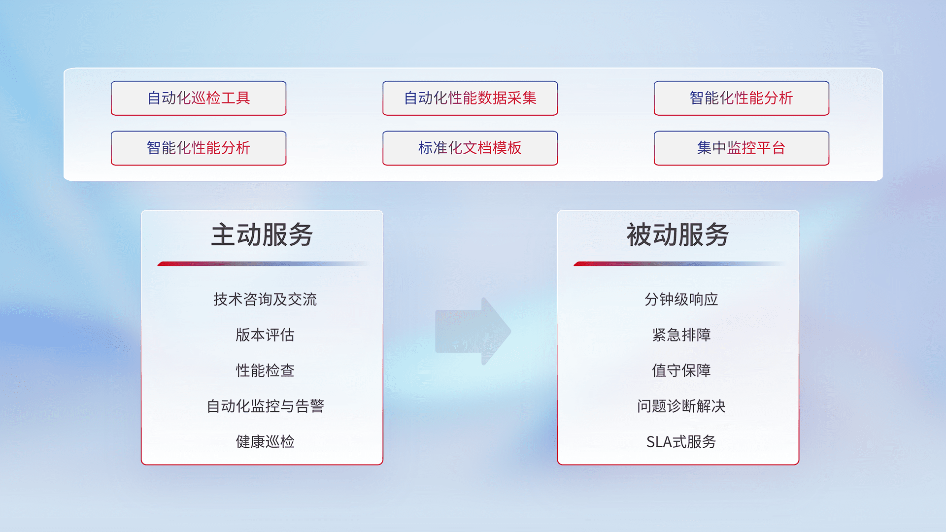 智能化工具和标准化文档,,,保障服务质量,,提供主动服务(包含技术咨询、、、、版本评估、、、性能检查、、自动化监控与告警、、、健康巡检)和被动服务包含(分钟级响应、、、、紧急排障、、、、值守保障、、、问题诊断解决、、SLA服务)。。。